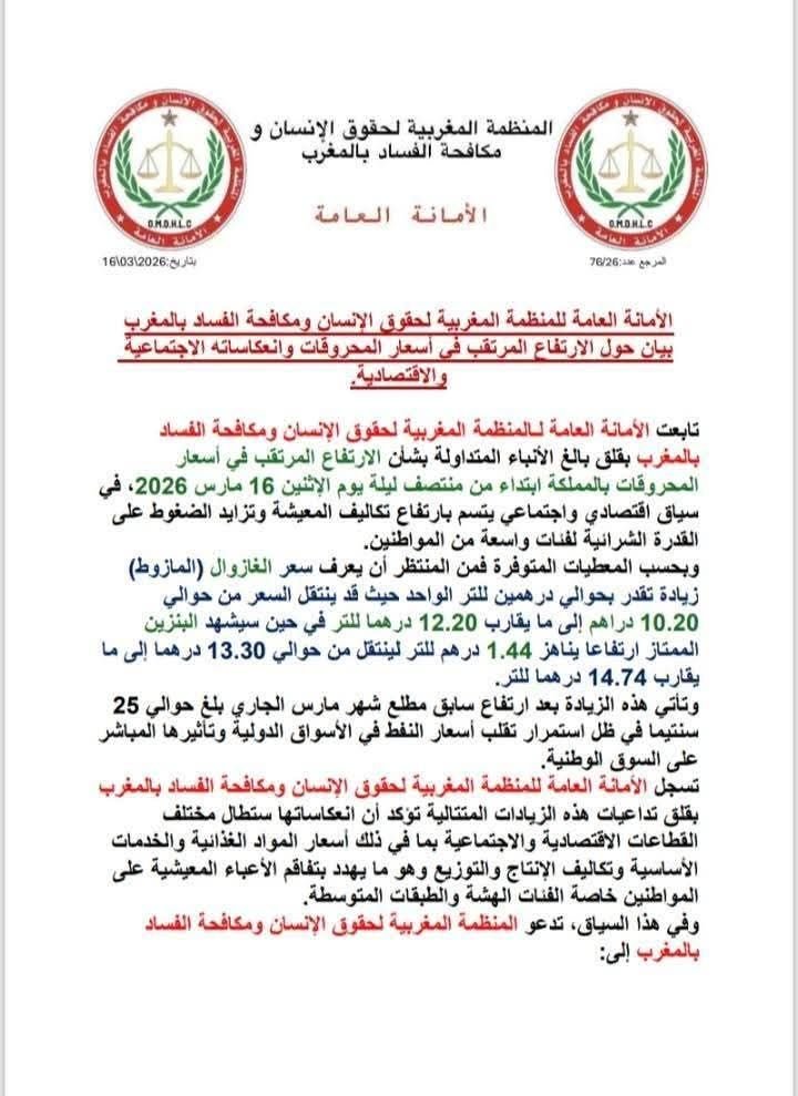أصدرت الأمانة العامة للمنظمة المغربية لحقوق الإنسان ومكافحة الفساد بالمغرب بيانًا عبّرت فيه عن قلقها من الارتفاع المرتقب في أسعار المحروقات ابتداءً من منتصف ليلة الإثنين 16 مارس 2026، في ظل تزايد تكاليف المعيشة وتراجع القدرة الشرائية للمواطنين.