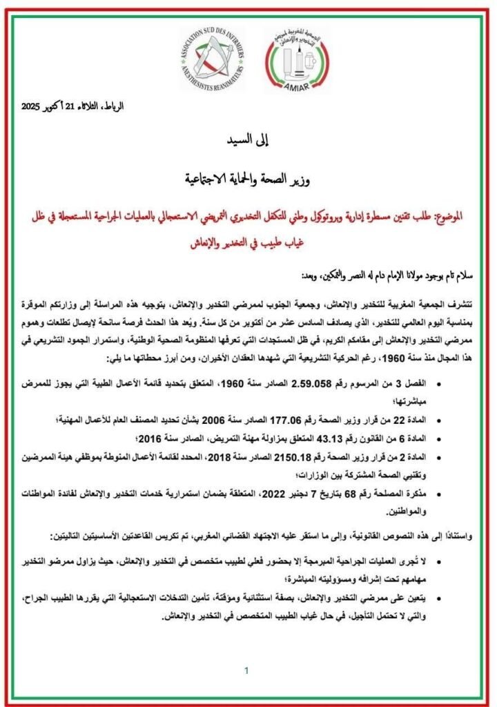 وجهت الجمعية المغربية للتخدير والإنعاش وجمعية الجنوب لممرضي التخدير والإنعاش، بمناسبة اليوم العالمي للتخدير (16 أكتوبر)، مراسلة رسمية إلى وزير الصحة والحماية الاجتماعية تطالبان فيها بتقنين مسطرة إدارية واعتماد بروتوكول وطني للتكفل التخديري التمريضي بالعمليات الجراحية الاستعجالية عند تعذر حضور طبيب التخدير والإنعاش.