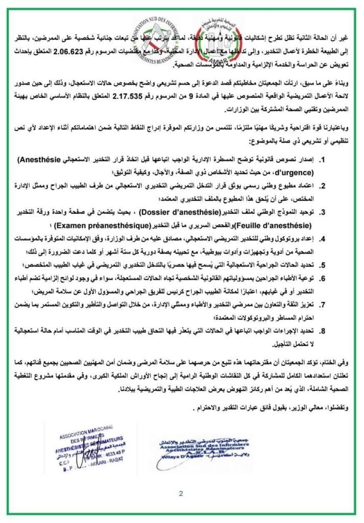 وطالبت الجمعيتان بحسم تنظيمي واضح إلى حين صدور اللائحة “الواقعية” للأعمال التمريضية المقررة في المادة 9 من المرسوم 2.17.535، عبر حزمة مقترحات أبرزها وضع مسطرة إدارية مضبوطة قبل اتخاذ قرار “التخدير الاستعجالي” تحدد ذوي الصفة والآجال وكيفية التوثيق؛ واعتماد مطبوع وطني رسمي يوثق قرار التدخل التخديري التمريضي الاستعجالي بتوقيع الطبيب الجراح وممثل الإدارة وإدماجه في الملف التخديري؛ وتوحيد النموذج الوطني لملف التخدير في صفحة واحدة تجمع “ورقة التخدير” والفحص السريري ما قبل التخدير حتى في الظروف العاجلة قدر الإمكان.